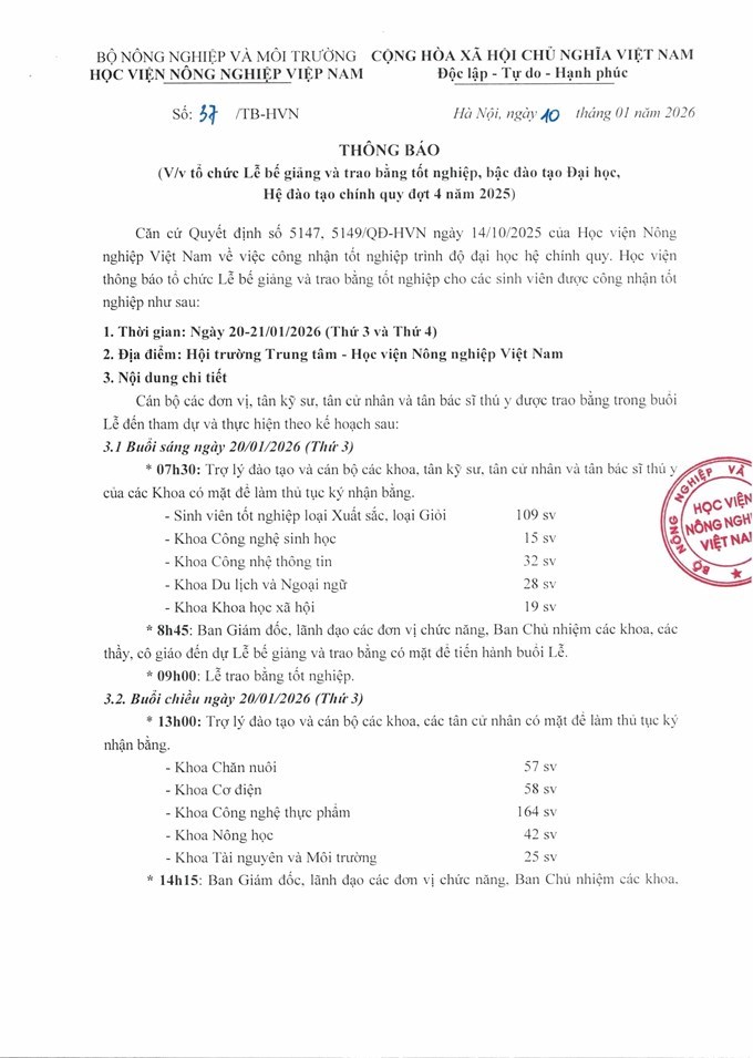 Thông báo Lễ bế giảng và trao bằng tốt nghiệp, bậc đào tạo Đại học, Hệ đào tạo chính quy đợt 4 năm 2025