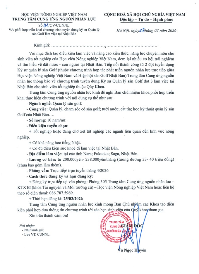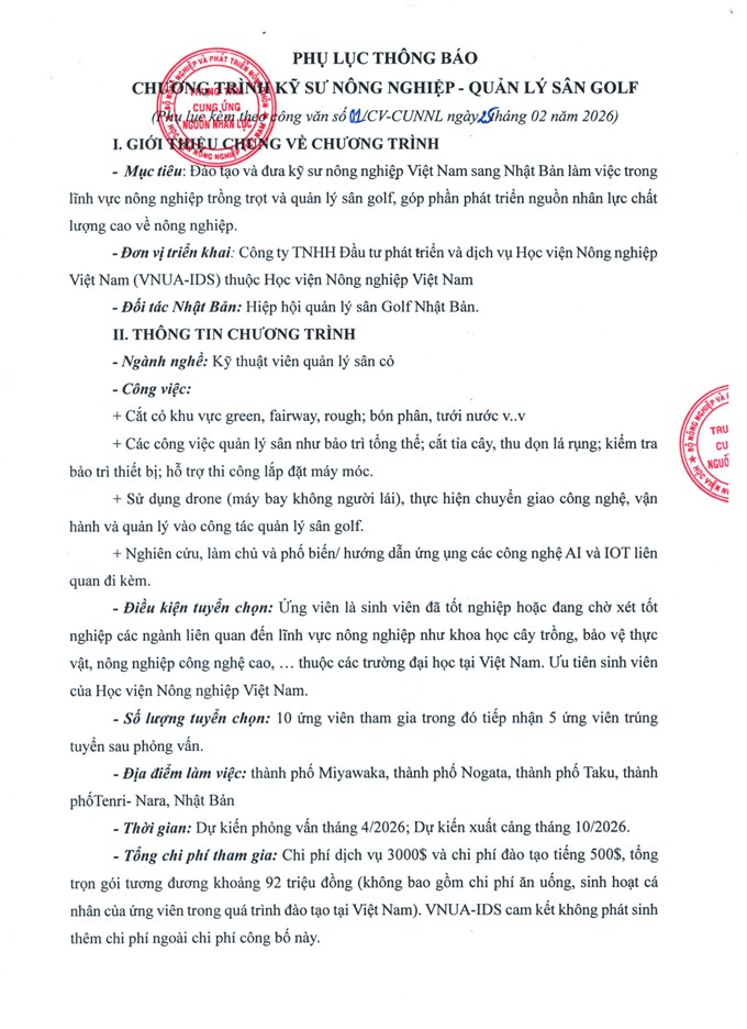 Thông báo v/v phối hợp triển khai chương trình tuyển dijng kỹ sư Quản lý sân Golf làm việc tại Nhật Bản