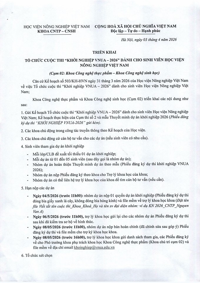Tổ chức "Cuộc thi khởi nghiệp VNUA_2026" dánh cho sinh viên Học viện Nông nghiệp Việt Nam