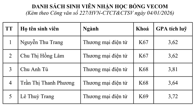Ngày 9/3/2026, trong khuôn khổ hợp tác giữa Học viện Nông nghiệp Việt Nam và Hiệp hội Thương mại điện tử Việt nam (VECOM), Khoa Kế toán và Quản trị kinh doanh - Học viện Nông nghiệp Việt Nam đã phối hợp với VECOM đồng tổ chức lễ trao học bổng “Chắp cánh tương lai” cho sinh viên ngành Thương mại điện tử thuộc khoa. Lễ trao học bổng thuộc dự án “ Trao học bổng cho 15 trường đại học là thành viên của Hiệp hội Thương mại điện tử Việt Nam (VECOM) năm 2026” do VECOM phát động.