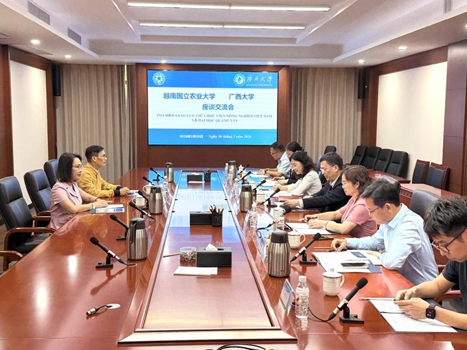 Tại đây, đoàn Học viện Nông nghiệp Việt Nam đã giới thiệu khái quát về Học viện, các lĩnh vực đào tạo và nghiên cứu nổi bật, đồng thời trao đổi về định hướng mở rộng hợp tác quốc tế dựa trên MoU đã ký kết giữa hai trường. Phía Đại học Quảng Tây cũng chia sẻ nhiều thông tin về quy mô đào tạo, năng lực nghiên cứu, mạng lưới hợp tác quốc tế, các chương trình học bổng, kinh nghiệm tiếp nhận sinh viên quốc tế và định hướng tăng cường hợp tác với các trường đại học trong khu vực ASEAN, trong đó có Việt Nam.